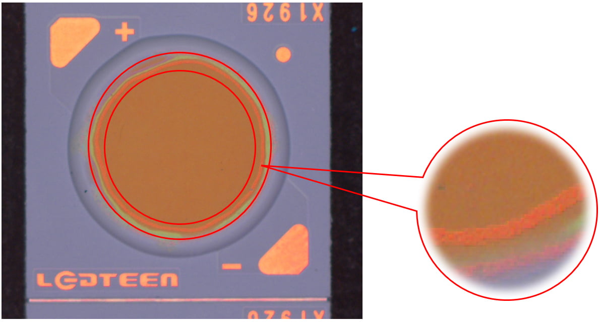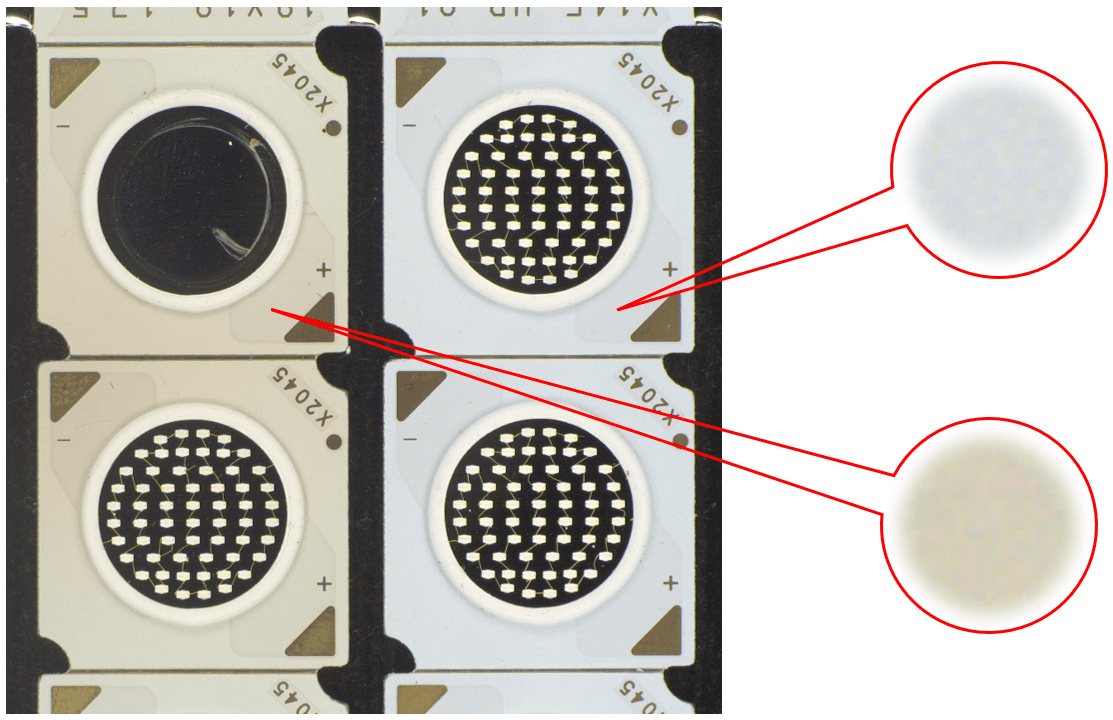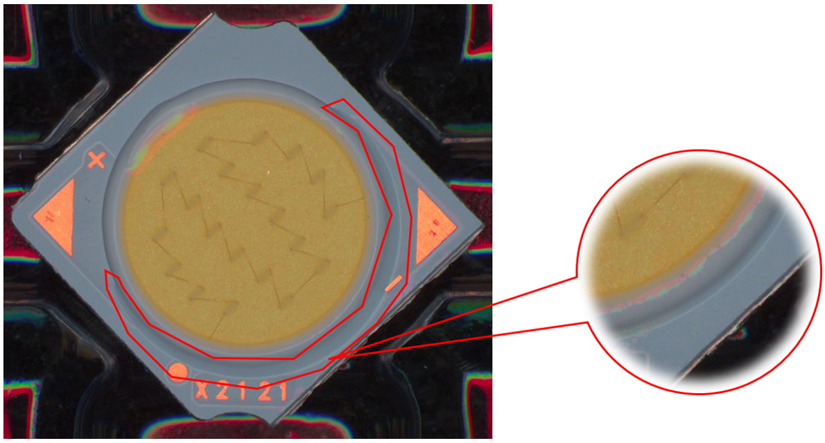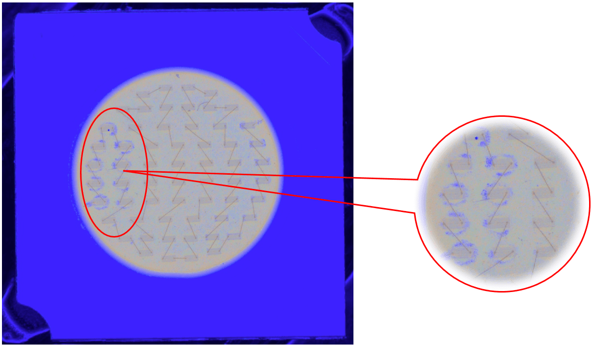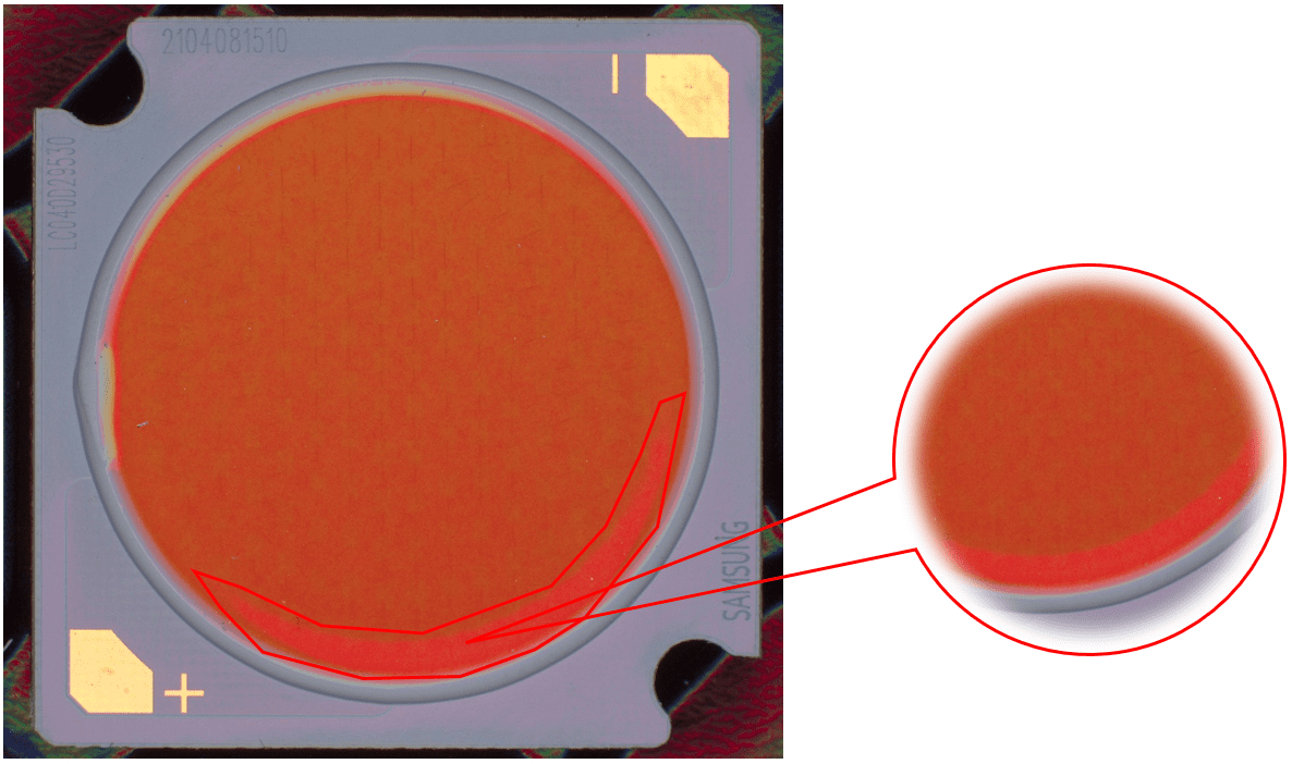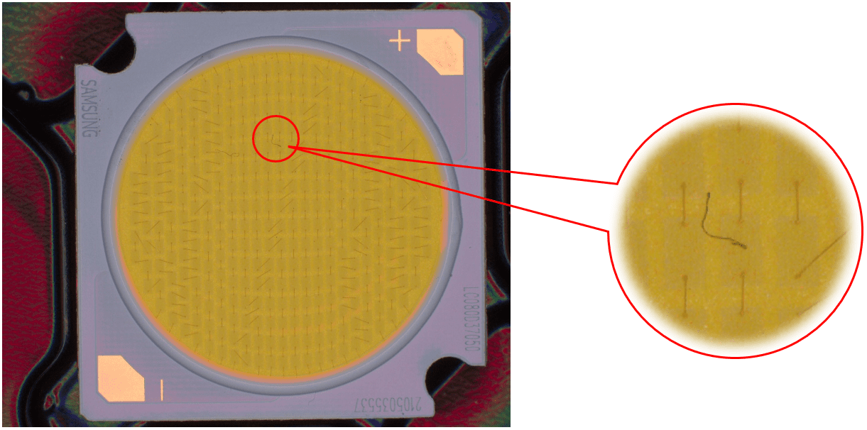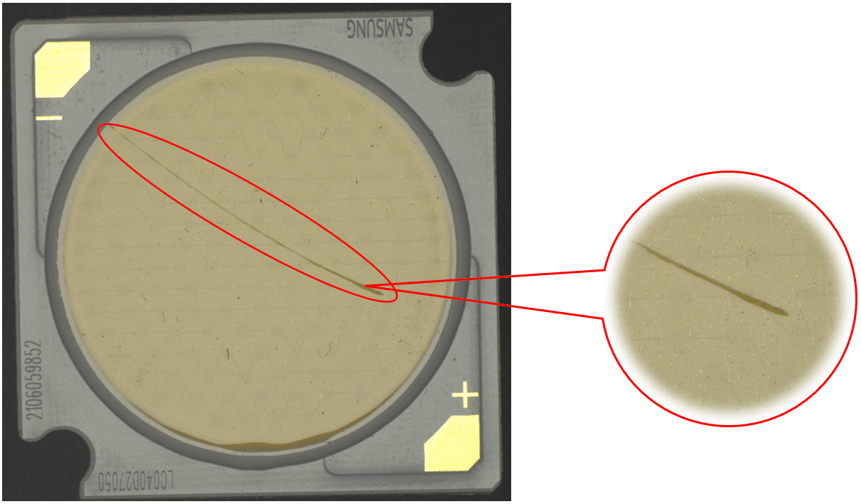 說明:燈珠表面有膠通過高角度垂直照射,凸顯出劃傷。