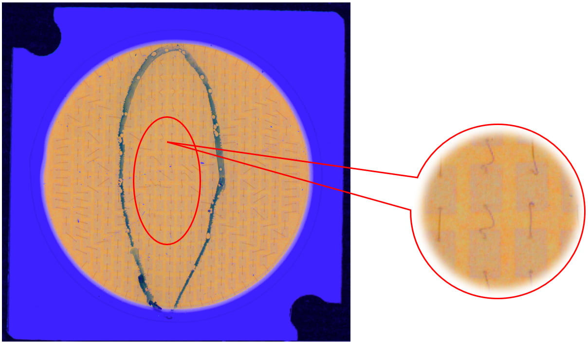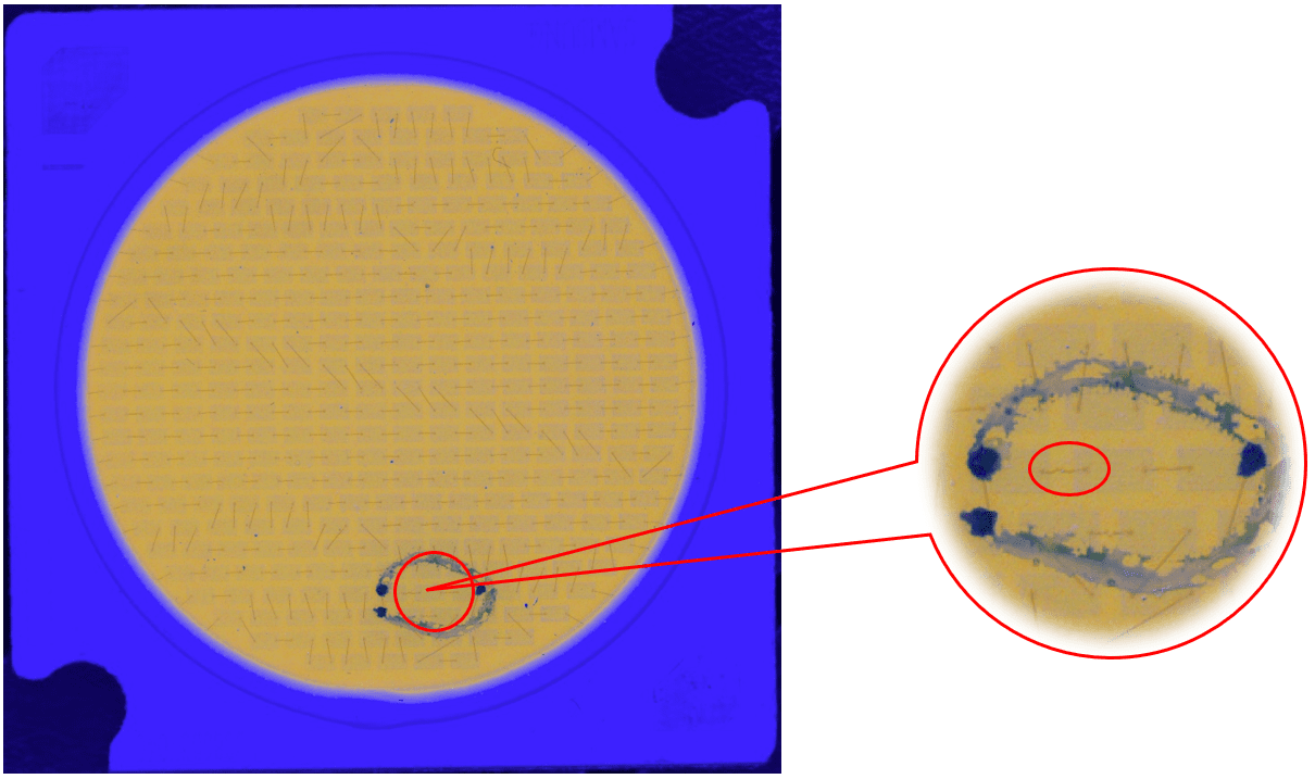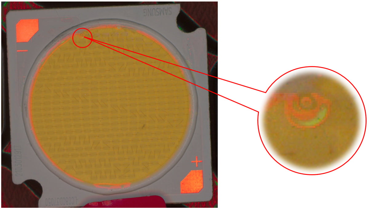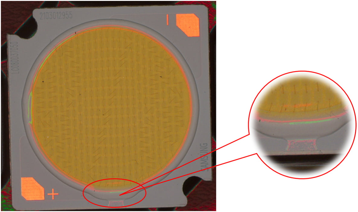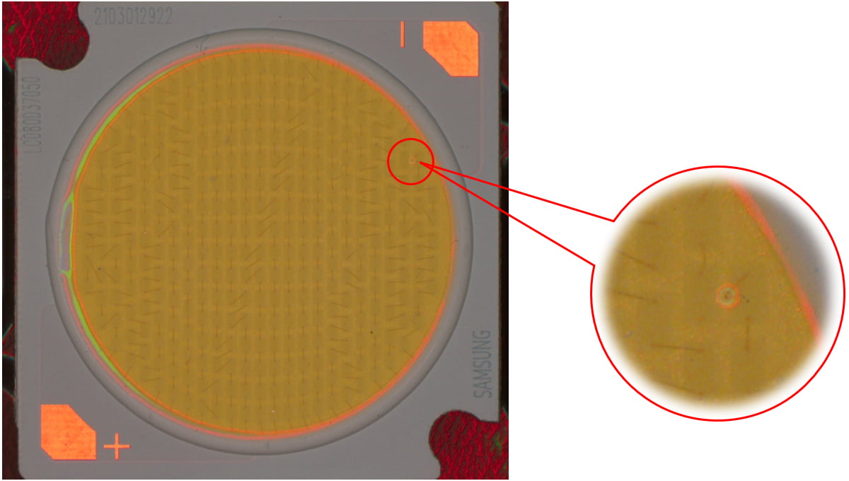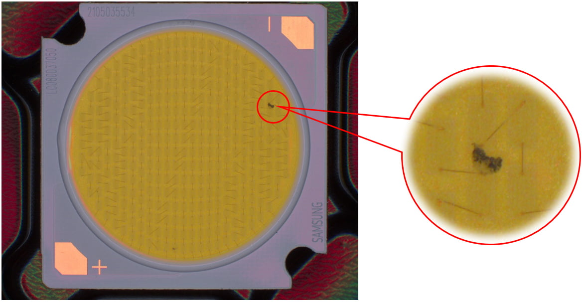 說明:燈珠表面有膠通過高角度垂直照射,凸顯出劃傷。