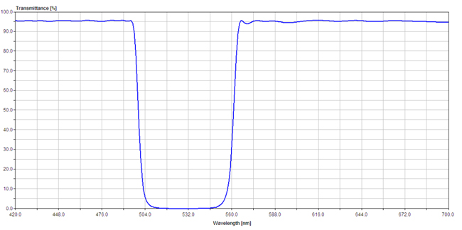 陷波濾光片設(shè)計(jì)用于在濾光片設(shè)計(jì)范圍內(nèi)透射所有其他波長的同時(shí)阻斷預(yù)選的帶寬。陷波濾光片適用于從光學(xué)系統(tǒng)移除單個(gè)激光波長或窄帶。