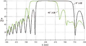 由于多層膜的各層薄膜的相對厚度,在射入傾斜光線時,光線通過薄膜中的光程會變長。因此,入射角度為0度(垂直)時,波長特性在最長波長一側,入射角度變大時,向較短波長一側移動。