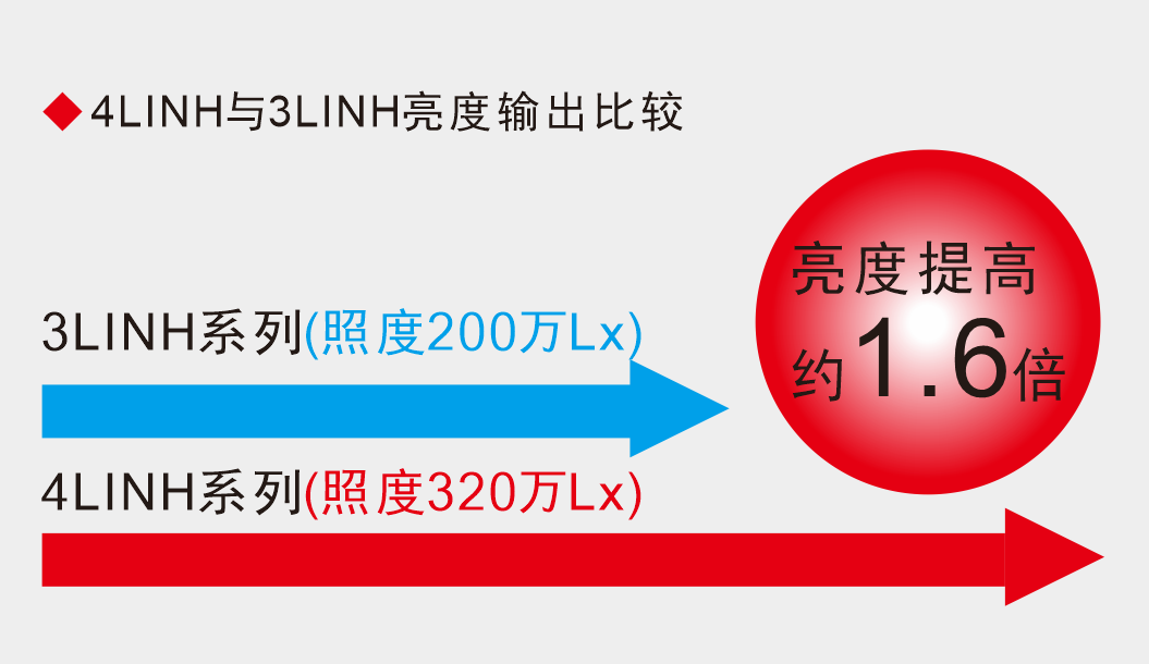4LINH是樂視科技最新研發(fā)的第4代超高亮線光源,采用高亮LED及獨特光學設計,相對于3LINH系列,照度提升1.6倍,重量減輕35%,體積減小20%,可7x24小時工作,照度可達到320萬Lx。