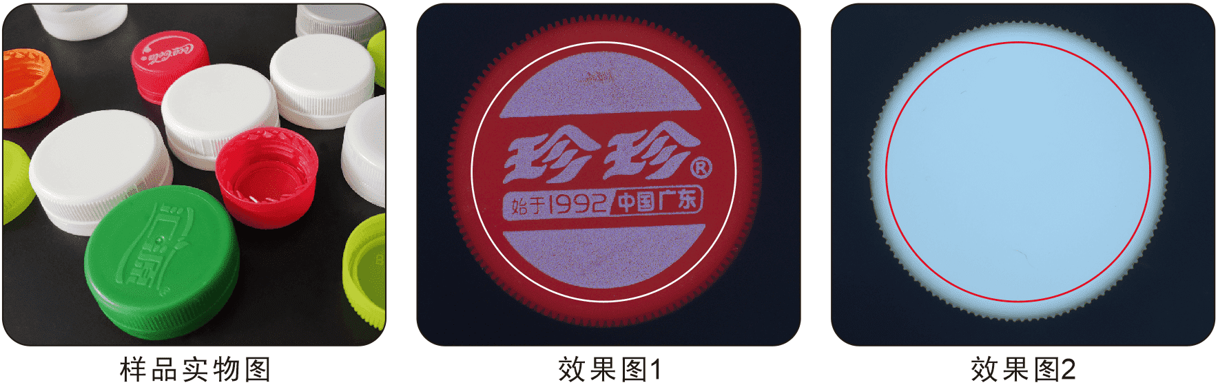 需求為檢測瓶蓋印刷字符有無檢測,此類檢測要求相對簡單,從圖片上看,不合格的為沒有印刷的白色無特征瓶蓋,合格的為帶顏色且有印刷字符的特征。經測試判斷采用環型無影光源拍攝,使檢測面均勻又能有很好的對比效果。