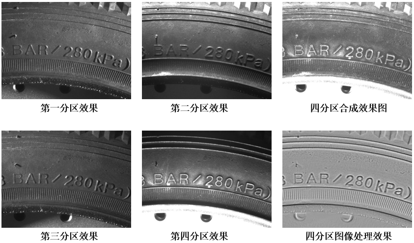 輪胎四個不同方向的成像都未能充分呈現(xiàn)字符。經(jīng)過多分區(qū)光源的照明,并借助光度立體算法,我們獲得了高對比度的圖像,這為算法的穩(wěn)定識別提供了可靠的圖像數(shù)據(jù)。