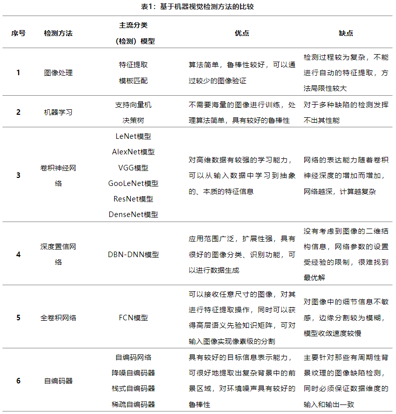 基于機器視覺的缺陷檢測方法的比較如表1所示,包括各種方法的主流分類(檢測)模型、優缺點對比。