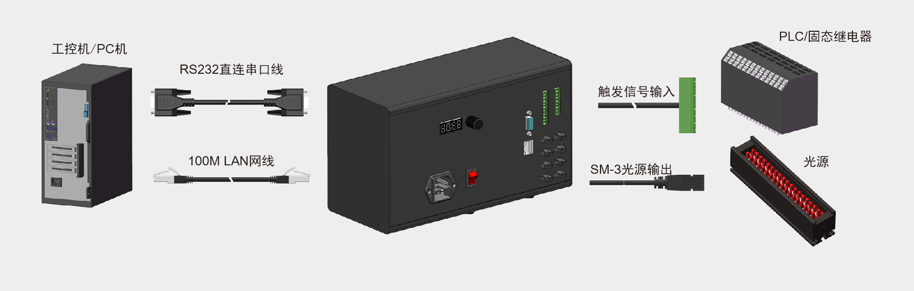 當(dāng)外部連接觸發(fā)信號(hào)時(shí),觸發(fā)“+”輸入高電平5-24V “-”接地時(shí),光源滅。
