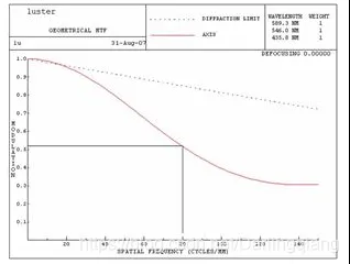 圖中橫坐標(biāo)是空間頻率,縱坐標(biāo)是MTF值。由于實(shí)際成像中總有像差存在,成像的對(duì)比度總是下降的,作為對(duì)比度衰減因子的MTF也總是小于1的。像面上任何位置的MTF值都是空間頻率的函數(shù)。一般地,空間頻率越高,MTF值越低,意味著高頻信息對(duì)比度衰減更快。例如圖中80 lp/mm的空間頻率對(duì)應(yīng)的MTF=0.52,意即對(duì)于中心視場來說,空間頻率為80 lp/mm的信號(hào)成像對(duì)比度要下降大約一半(相對(duì)于實(shí)際目標(biāo)來說)。