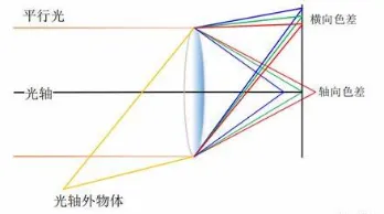 理論上色差在影像中央及邊緣都可以發(fā)生,不過由于邊緣的光程較長,因此色差也就特別明顯。由于短波長的折射率較高,因此紫色對(duì)色差也特別敏感。