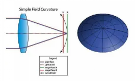 在一個(gè)平坦的影像平面上,影像的清晰度從中央向外發(fā)生變化,聚焦形成弧型,就叫場曲。場曲導(dǎo)致視場邊緣相對(duì)中心清晰度下降,也即MTF下降。