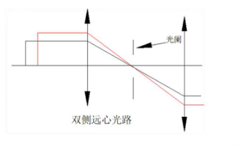 雙側遠心光路就是我們常說的雙遠心光路,光路圖如下圖。它綜合了像方遠心和物方遠心的雙重優點,在景深范圍內,物體離得遠近或者相機離得遠近,都不會影響到成像系統的放大倍數,即像不隨物距和相距的變化而變化。根據雙側遠心光路設計出來的鏡頭為雙遠心鏡頭。