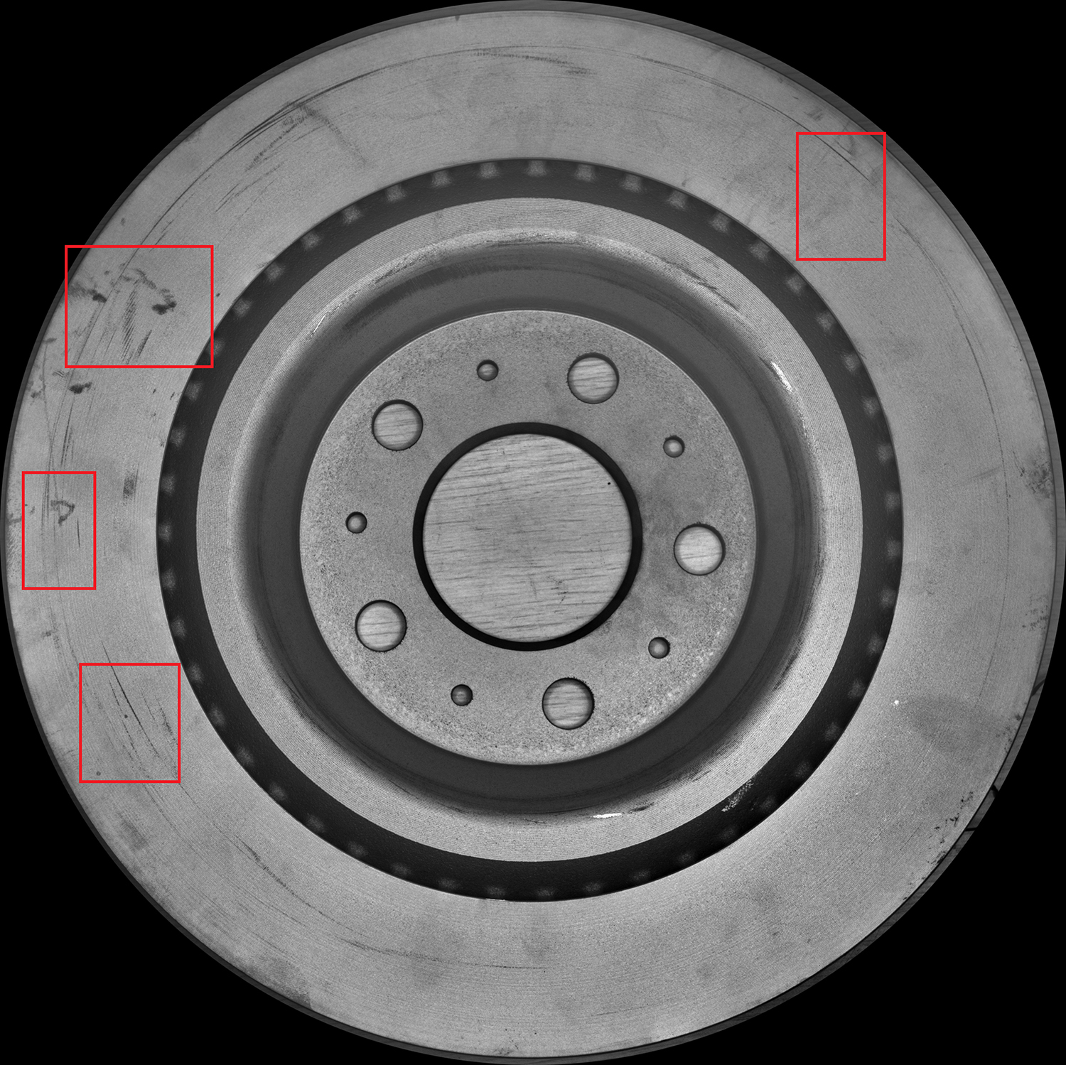 在汽車制造領域,剎車盤作為車輛制動系統的關鍵安全部件,其質量直接影響到駕駛員的行車安全。剎車盤生產過程中因不同生產工藝、生產環境、人工操作等因素,其成品常存在多種缺陷。表面缺陷主要有劃痕、砂眼、凹坑、生銹、磕碰、裂紋、風道異物等,這些缺陷會直接影響剎車盤的強度、硬度、應力、承受力等多項技術指標,從而縮短使用壽命,并帶來嚴重的安全隱患。因此,對剎車盤外觀缺陷進行精確檢測顯得尤為重要。