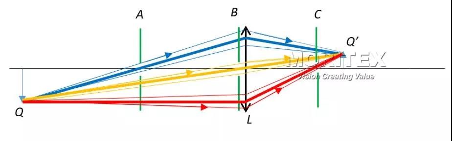 從圖1中可以看出,當(dāng)孔徑光闌放置在位置A時(shí),由物點(diǎn)Q發(fā)出的各個(gè)方向的光,只有藍(lán)色光束參與成像; 當(dāng)孔徑光闌放置在位置B時(shí),只有黃色光束參與成像; 當(dāng)孔徑光闌在位置C時(shí),只有紅色光束參與成像。雖然物點(diǎn)Q經(jīng)透鏡成像后,像點(diǎn)在Q’處,但因?yàn)榭讖焦怅@的位置不同,導(dǎo)致了參與成像的光束是不一樣的。