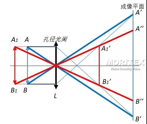 為了解決這個(gè)問(wèn)題,我們把孔徑光闌放置在透鏡像方的焦平面上,如圖2(b),此時(shí)由于孔徑光闌選擇成像光束的作用,只有物體發(fā)出的主光線平行于光軸的很細(xì)的一束光參與成像,所以,無(wú)論物體位于位置AB還是A1B1,他們的主光線是重合的,其在成像平面上的投影中心點(diǎn)是相同的,因此,雖然物體位于A1B1時(shí),其像仍然是A1’ B1’,但在成像平面上的彌散斑的中心間距A1’’ B1’’=A’B’,這樣就解決了上述因近大遠(yuǎn)小,導(dǎo)致測(cè)量不準(zhǔn)的問(wèn)題。這個(gè)光路的特點(diǎn)是入瞳位于無(wú)窮遠(yuǎn),物方參與成像光束的主光線平行于光軸,故稱此光路為“物方遠(yuǎn)心光路”,而用“物方遠(yuǎn)心光路”設(shè)計(jì)的鏡頭稱“物方遠(yuǎn)心鏡頭”。