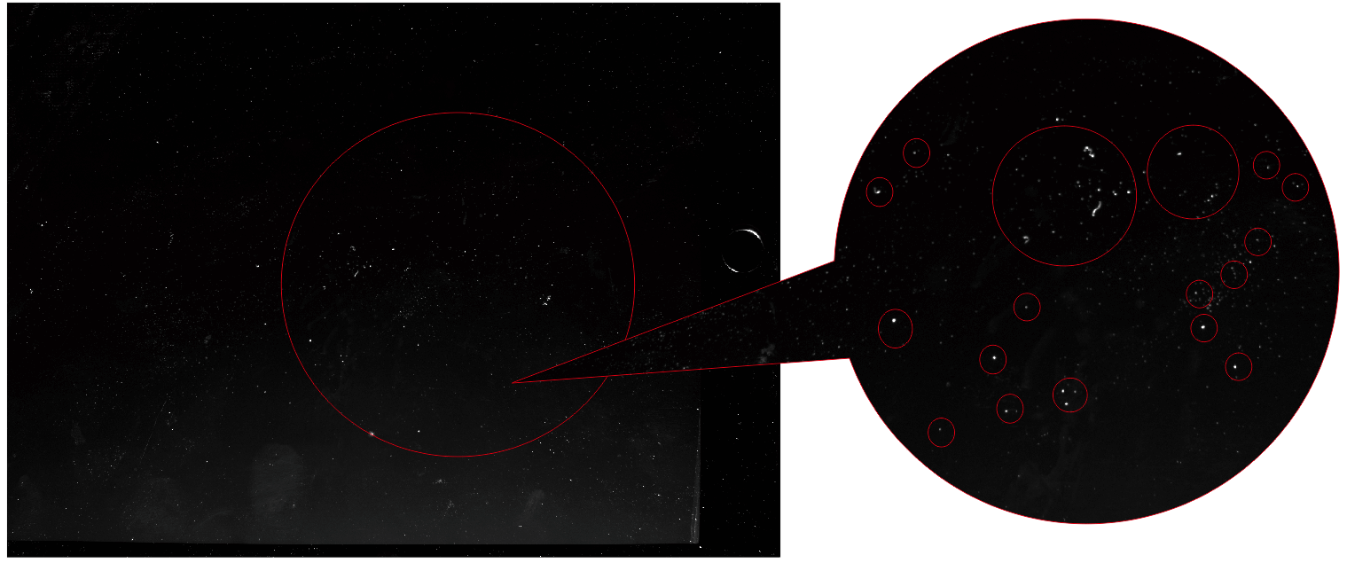 從效果圖上看迷你線光源3LINR220-W照射的灰塵顆粒要多,而且與實(shí)際面積大小相符,對應(yīng)的檢測精度要高;條形光源4BR15030-W只能檢測大灰塵顆粒,與實(shí)際面積對比有所差異。具體效果如下圖所示: