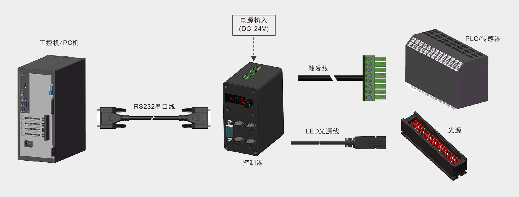 當(dāng)外部連接觸發(fā)信號(hào)時(shí),觸發(fā)“+”輸入高電平5-24V “-”接地時(shí),光源滅。