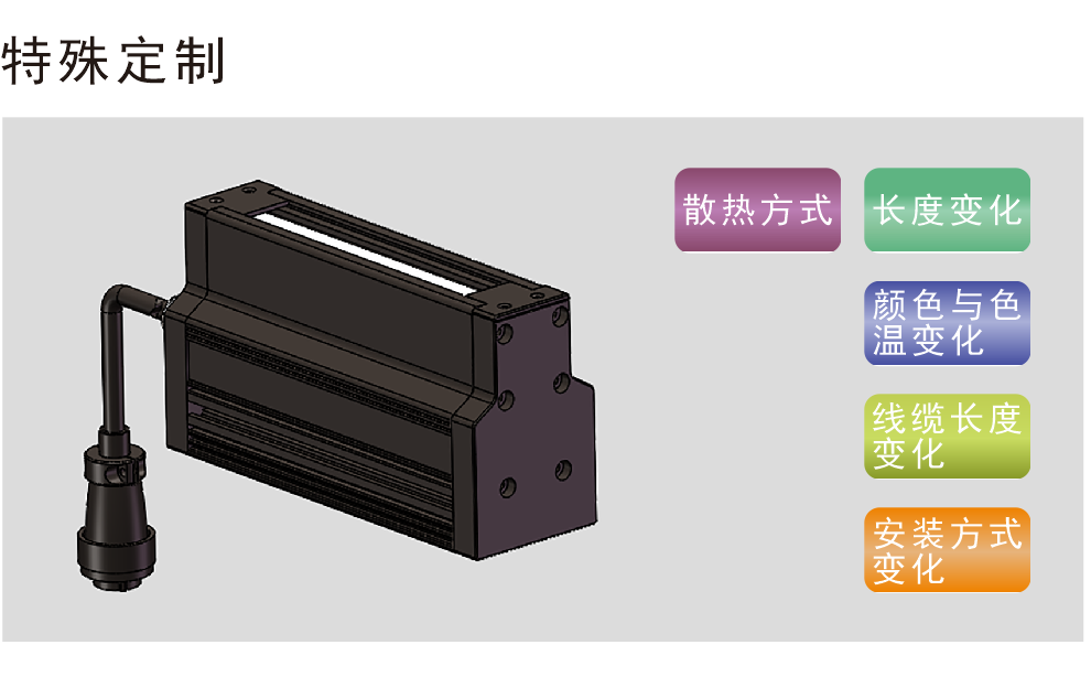 * 最長(zhǎng)可定制5米。紫外和紅外光源可根據(jù)客戶要求定制。 * 發(fā)光峰值波長(zhǎng)/相關(guān)色溫:紅色:620-630nm,綠色:525-530nm,藍(lán)色:465-470nm,白色:6600K(色溫)。 * 按100mm單位提供各種發(fā)光面尺寸。關(guān)于其他尺寸的詳細(xì)內(nèi)容,請(qǐng)向本公司 銷(xiāo)售負(fù)責(zé)人進(jìn)行咨詢(xún)。 |