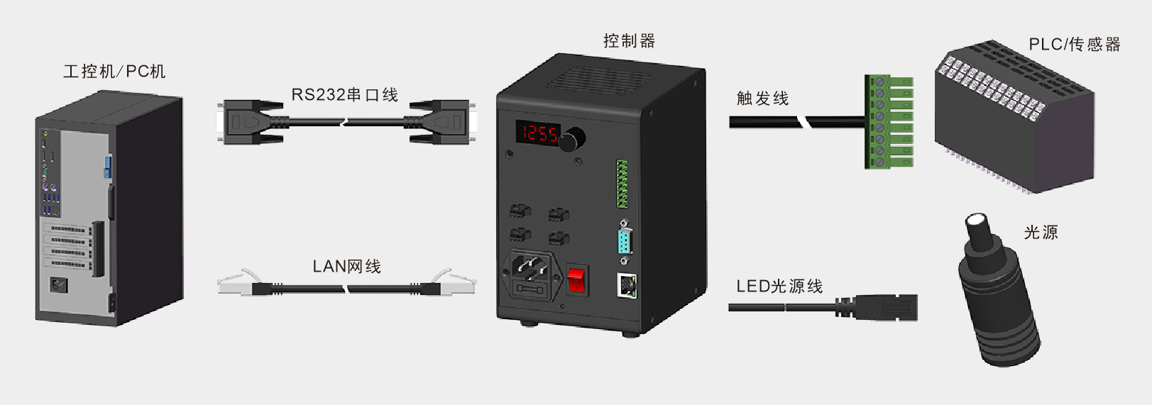 當(dāng)外部連接觸發(fā)信號時(shí),觸發(fā)“+”輸入高電平5-24V “-”接地時(shí),光源亮。