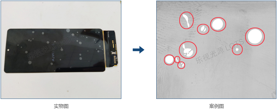 屏幕中層膜貼合會有氣泡,使用同軸線光,能更好的突顯出氣泡,藍色可以有效的提升效果的對比度,更利于圖像處理。