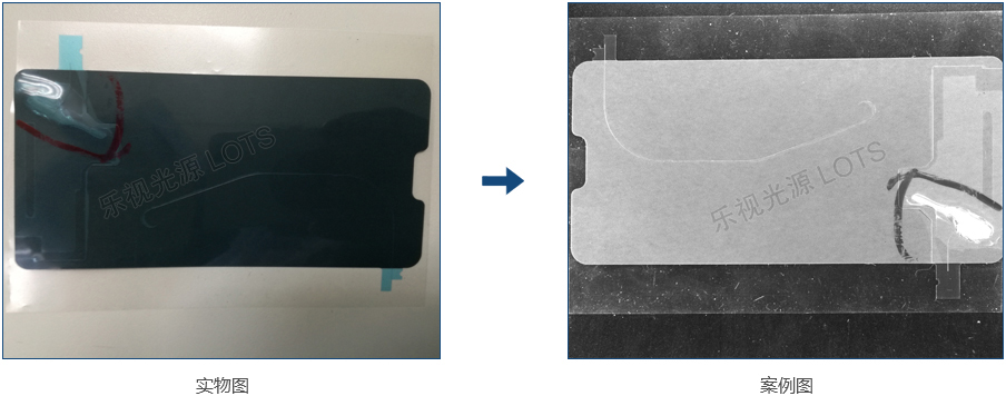屏幕顯示層有異物、缺口、多料情況,在膜內部檢測出缺陷,需要考慮到膜的干擾,使用四條組合條光凸顯出缺陷位置,低角度用光排除其他干擾。