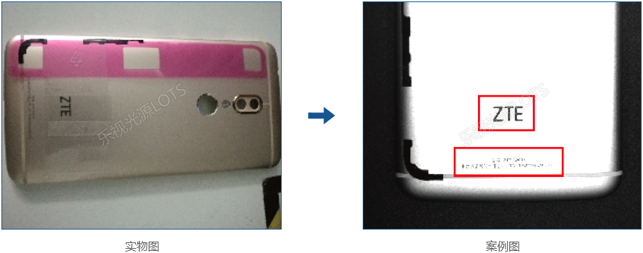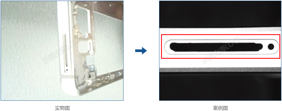 手機邊殼帶點曲面,使用方形無影光源向邊殼各個方向均勻照射,邊緣輪 廓明顯,達到檢測目的。
