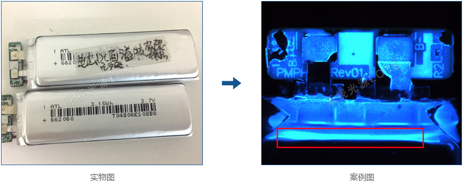 采用同軸光源垂直均勻打亮表面,點膠后膠水與表面反光程度不同,膠水輪廓與表面產生明顯對比。